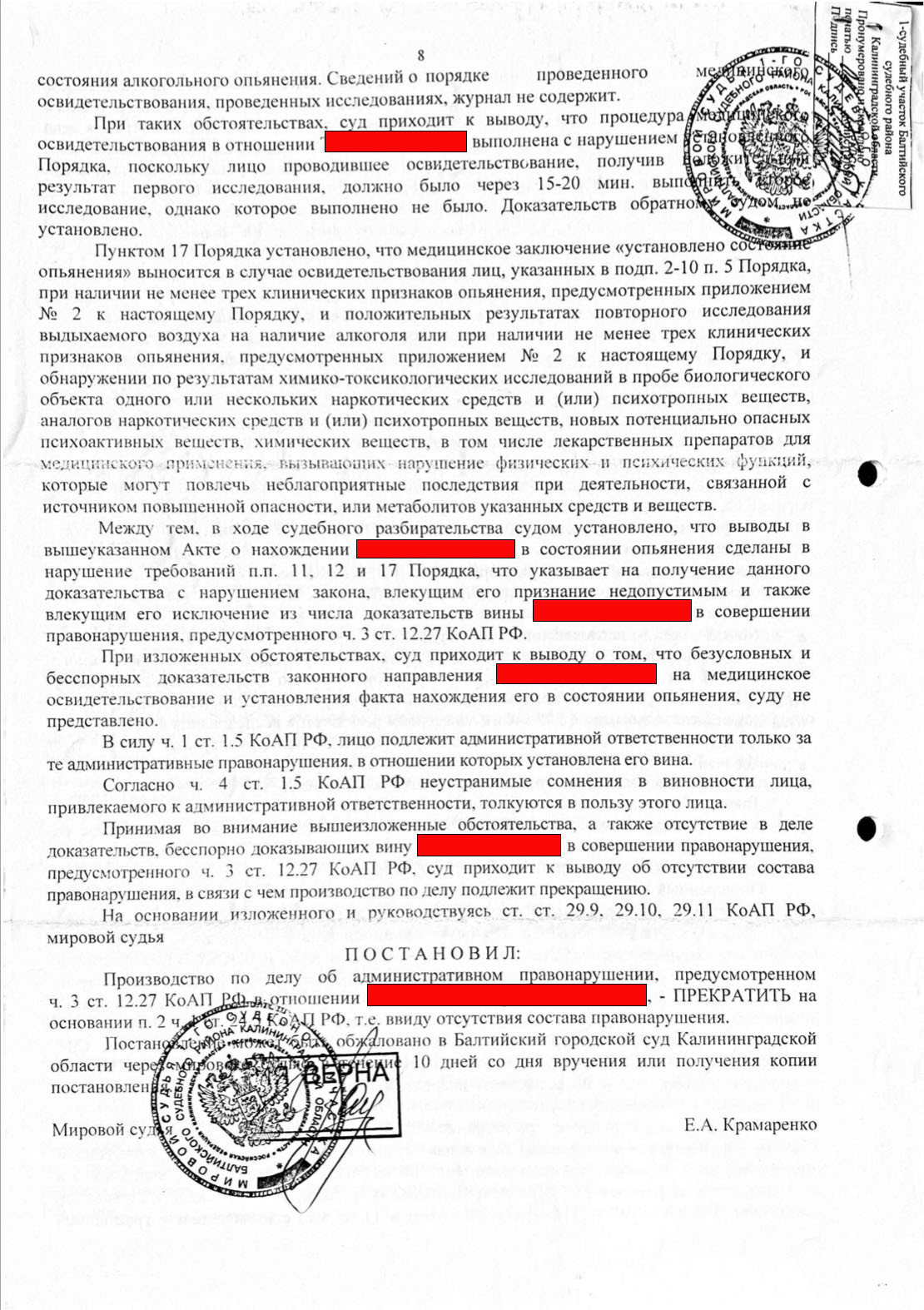 Мировой суд пришел к выводу, что процедура освидетельствования в отношении НАШЕГО ДОВЕРИТЕЛЯ выполнена с нарушением.